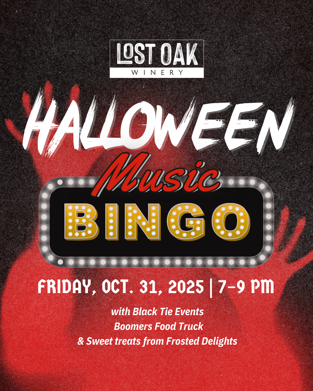 Get ready for a hauntingly good time this Halloween at Lost Oak Winery. Join us on Friday, October 31st, from 7–9 PM in the Tasting Room for Halloween Music Bingo hosted by Black Tie Events.