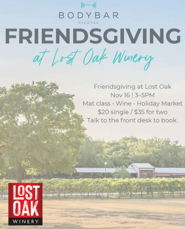 Gather your friends and celebrate Friendsgiving in a unique way! Lost Oak Winery in Burleson, TX, is teaming up with BODYBAR Pilates for a relaxing and rejuvenating afternoon of fitness, wine, and holiday shopping on Sunday, November 16th, 2025.