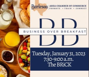 The Burleson Chamber Diplomats will be hosting their first Business over Breakfast event on January 31st from 7:30 a.m. - 9 a.m. at the Burleson Recreation Center (BRiCK). The goal of the Business over Breakfast is to provide another opportunity to market our Chamber businesses and organizations to the community.
