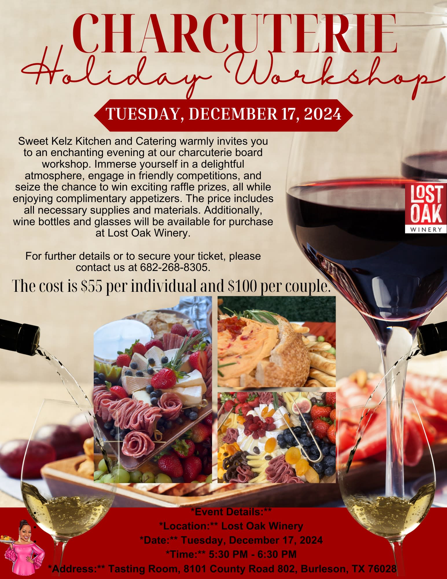 Sweet Kelz Kitchen and Catering cordially invites you to partake in an enchanting evening featuring our charcuterie board workshop in the Lost Oak Winery Tasting Room. Immerse yourself in a delightful atmosphere, participate in friendly competitions, and seize the opportunity to win exciting raffle prizes, all while enjoying complimentary appetizers. Wine by the bottle or by the glass is available for purchase from Lost Oak Winery.