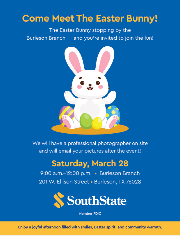 HOP on in and join the fun! Get a Free Picture with the Easter Bunny at SouthState Bank in Old Town! Saturday March 28, 2026 9AM- 12PM