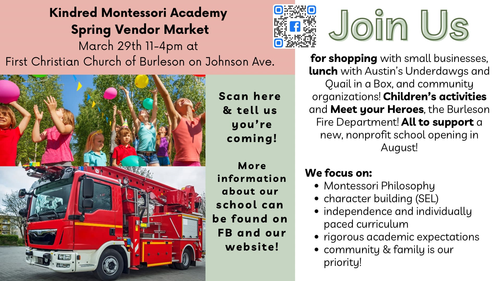 We want to welcome the community to our FREE spring market event where vendors will showcase their business, organization, or wares! We will have performers, food trucks, and a SILENT AUCTION! This event is a fundraiser for Kindred Montessori Academy a new school opening in August 2025 serving 18 months through 6th grade! Austin's Underdawgs will be there from 11:30-2:00 pm, you can purchase a pre-event ticket for $10. You'll also see Quail In a Box, Care's Freez Dried Candy, among many more!