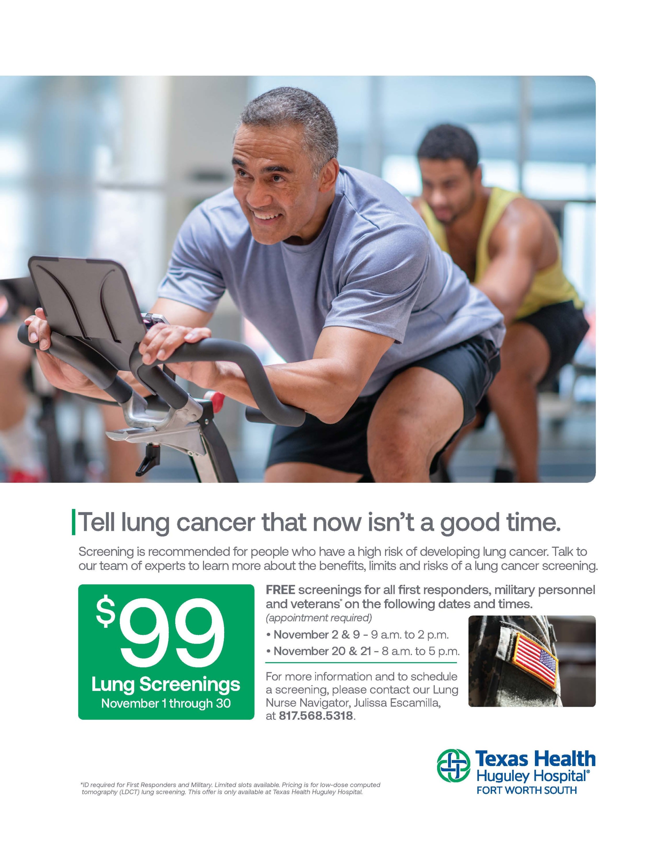 Free screenings for all first responders, military personnel and veterans on the following dates: Nov 2 & 19 - 9am to 2 pm Nov 20 & 21 - 8am to 5pm. All other lung screenings $99 November 1 through November 30.