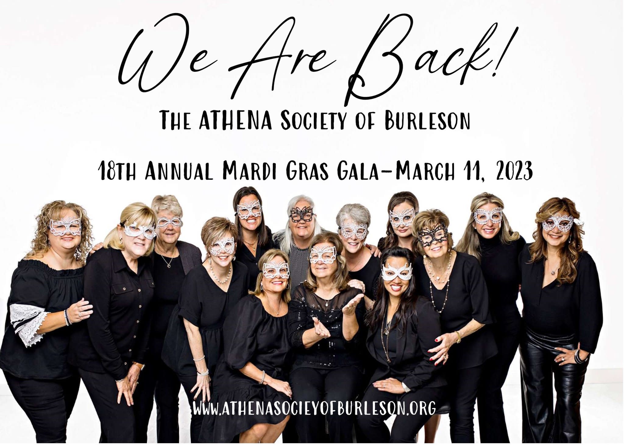 We Are Back! The ATHENA Society of Burleson is thrilled to be hosting the 18th Annual Mardi Gras Gala. We have some EXCITING new additions to the Gala, you won't want to miss the evening! The Mardi Gras Gala proceeds benefits Johnson County and Burleson Residents by assisting cancer patients, patients with life threatening illnesses, and supporting educational opportunities through Non-Profit organizations. Tickets can be purchased at sites.google.com/view/athena-society-of-burleson/mardi-gras-galaImages
